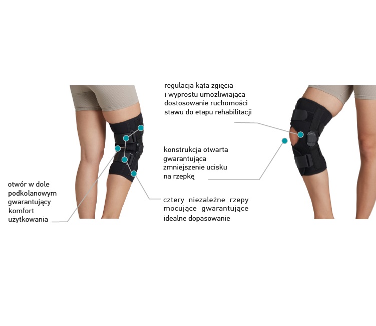 The orthosis is used especially in cases of knee joint instability, rheumatic inflammation, mild ligament insufficiency as well as in the case of femoro-patellar syndrome.Ideal for cruciate ligament injuries (ACL or PCL) associated with instability. Also used in the post-treatment process after surgical procedures such as meniscus suturing, ligament reconstruction, after knee joint injuries such as sprains or dislocations, which require setting a specific range of motion in the joint, i.e. angular adjustment of flexion and extension.